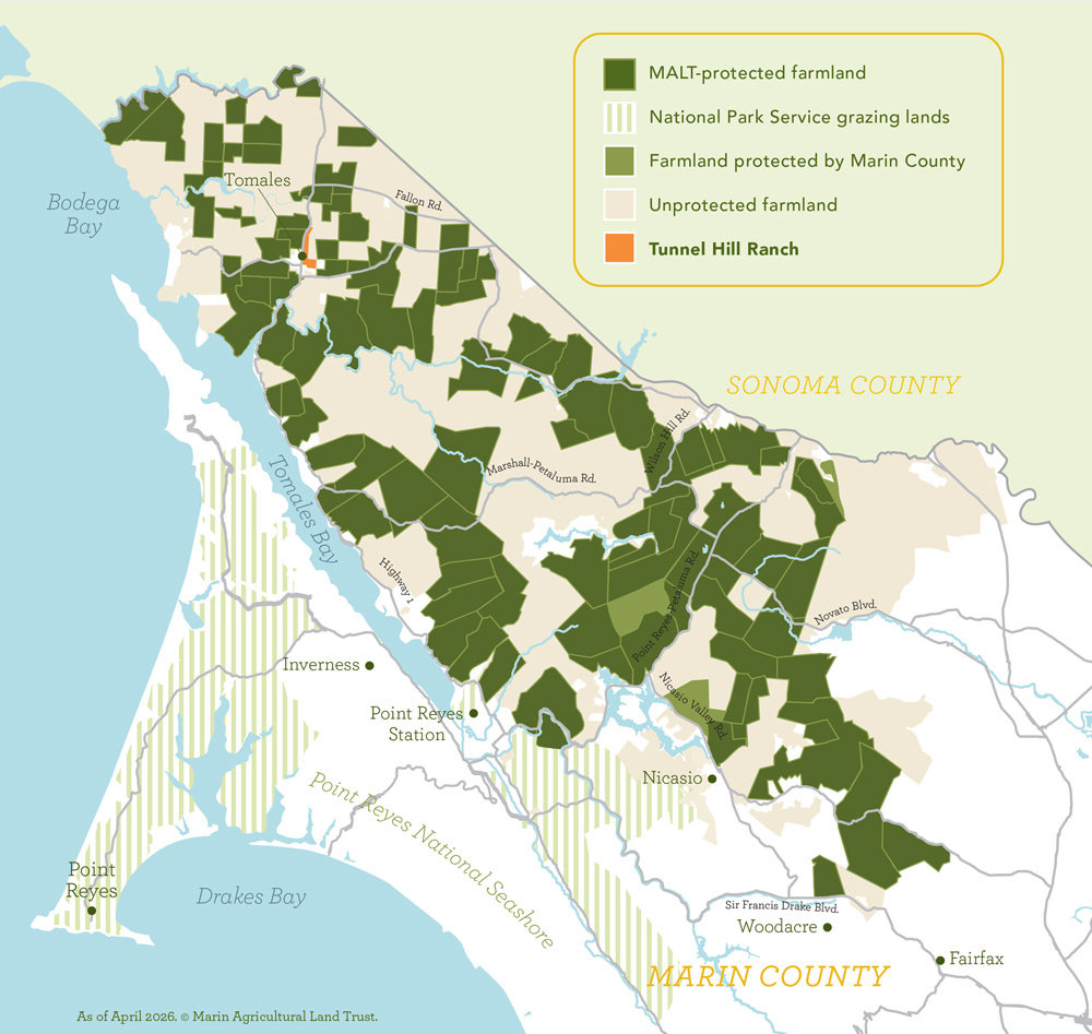 Marin County’s Measure A program, a one-quarter of one-percent sales tax approved by voters in 2012 and renewed in 2022, dedicates up to 10 percent of its annual revenue to grants that fund agricultural conservation easement acquisition. The county will provide fifty percent of the Tunnel Hill Ranch easement acquisition funding, with MALT raising the remainder through private donations.