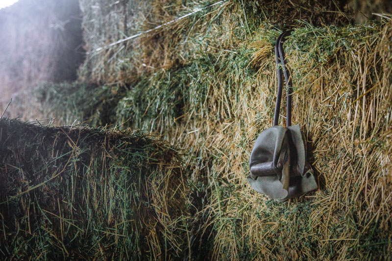 Hay forks rest against stacked bales at Marshall Home Ranch—everyday tools of the ranching life.