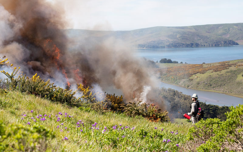 In the Walker Creek watershed, we partnered with Fire Forward, UC Berkeley, and local ranchers to experiment with something new: using prescribed fire to combat gorse, a highly invasive plant consuming valuable rangeland across Marin County. Watching flames reach 30 feet into the air as they consumed the thorny invader was dramatic—but the real breakthrough was what we learned about timing.